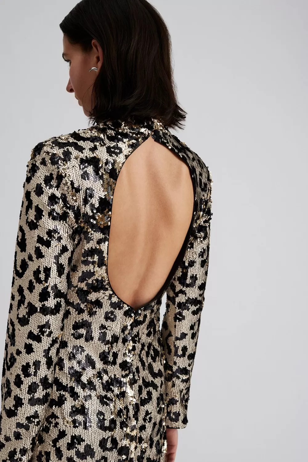 Maxiklänning i paljett med öppen rygg, långa ärmar och slits bak. DETALJER Paljettmönster Slits i bak Öppe…