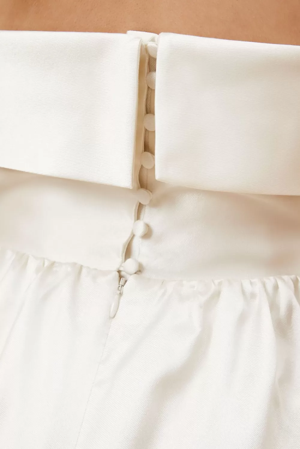 Kort bröllopsklänning i skimrande material med definierad midja. DETALJER Klädda knappar Bandeu design Defini…