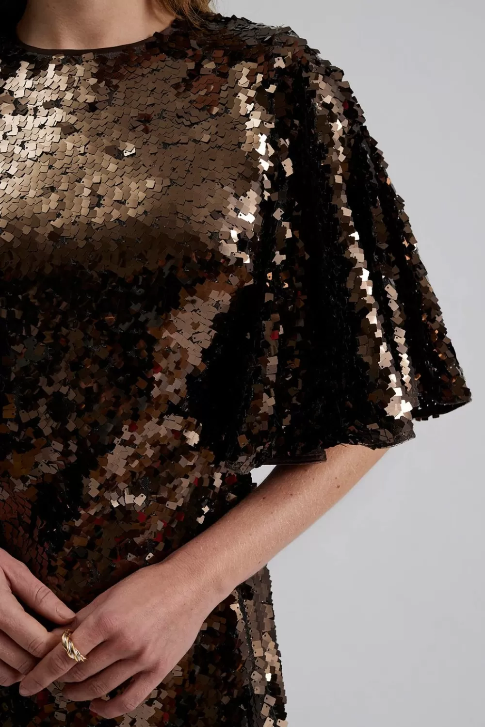 Miniklänning med paljetter och vid ärm DETALJER Rundhalsad Dold dragkedja baktill Axelvaddar Yttertyg: 1…