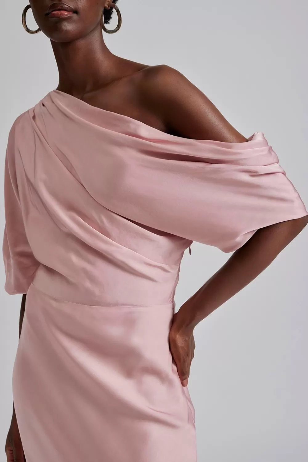 Maxiklänning i satin med asymmetrisk halsringning, kort ärm och draperade detaljer. DETALJER Asymmetrisk urringnin…