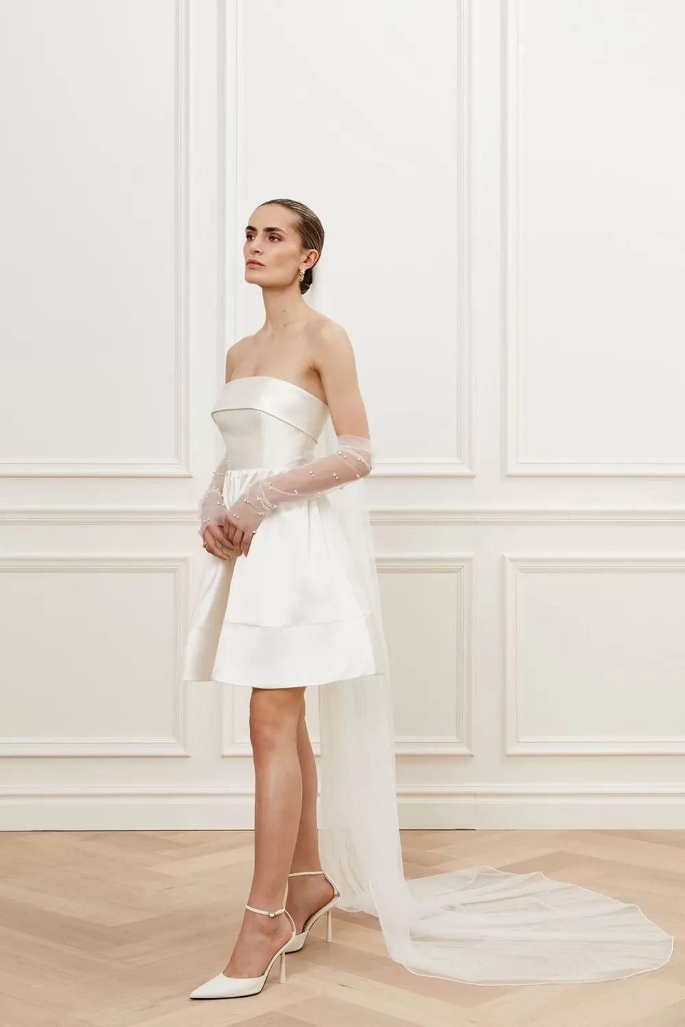 Kort bröllopsklänning i skimrande material med definierad midja. DETALJER Klädda knappar Bandeu design Defini…
